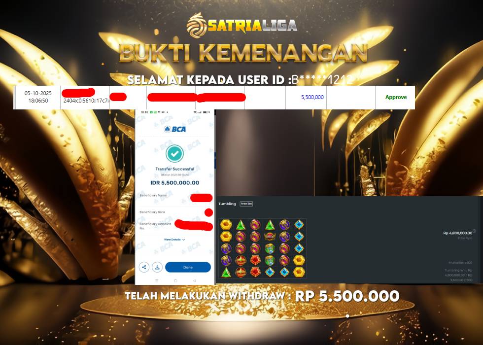 Selamat kepada user id : B*****1212 telah berhasil mendapatkan kemenangan dan melakukan withdraw sebesar Rp 5.500.000